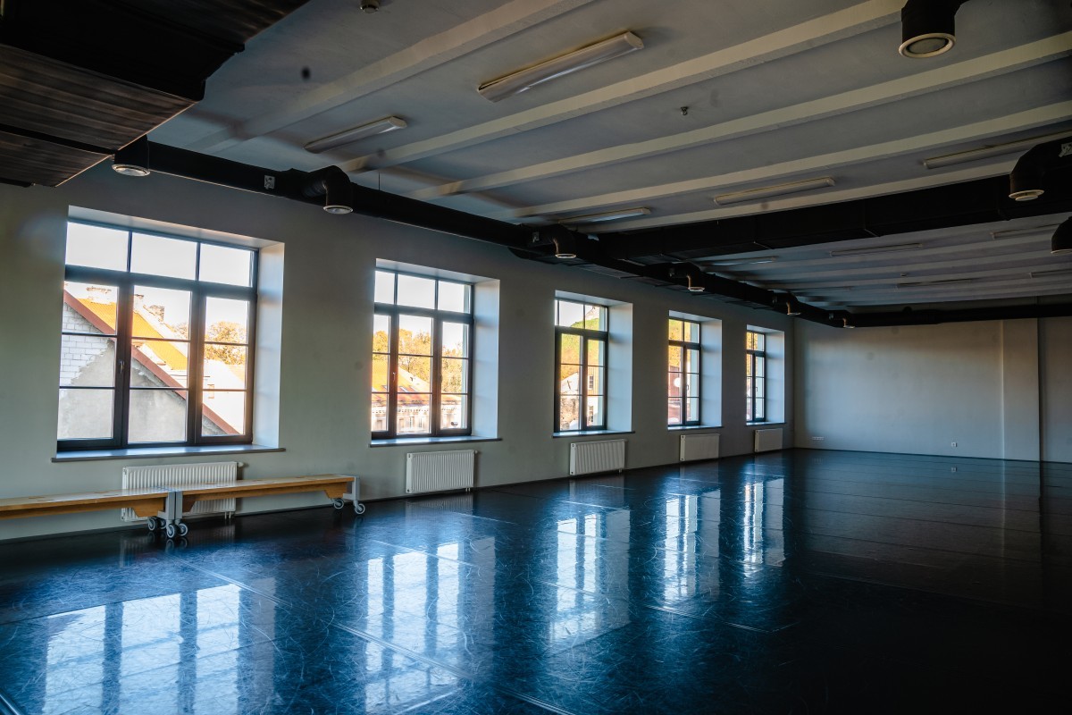Trečiojo aukšto studija puikiai pritaikyta cirko ir šokio repeticijoms, seminarams.